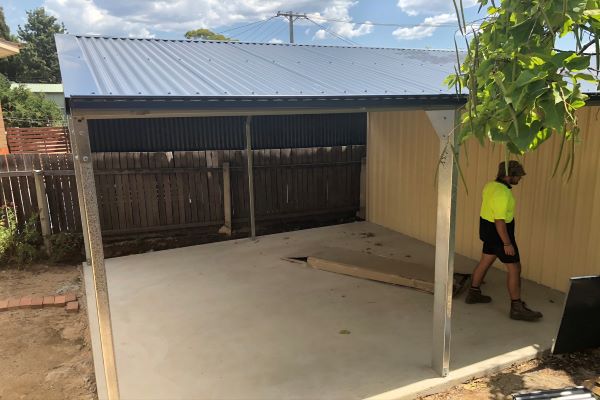 This Garage was built in Weston and was made to be the exact dimensions allowable under schedule 1 of the Planning and Development Regulation 2008. It has a total length of 10m, and floor area of 50sqm, this is broken into a enclosed section of 25sqm and a carport area of 25sqm. This Shed was completed with Trimdek Walls and Corrugated Roof. The colours were Classic Cream and Deep Ocean.